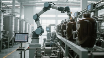 现代化工业场景,蓝色为主色调,清新明亮的光线,干净整洁的生产线,透明玻璃幕墙外是蓝天白云,绿色植物点缀在车间角落,机械臂精准运作,地面反光如镜,整体氛围充满科技感与希望