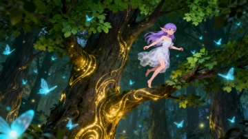 画面呈现从少女背后望向天空飞机的鱼眼镜头视角,绿色调森林中巨大蘑菇房子错落分布,少女与狗的背影面向掠过的飞机,鱼眼效果带来独特的空间扭曲感与广阔视野,整体色调温馨和谐。