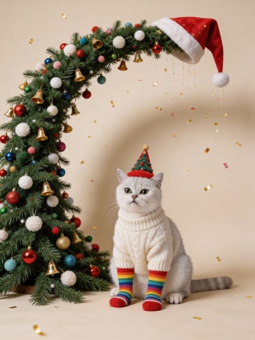 软3D风拟人猫戴圣诞帽,穿毛衣彩虹袜,坐于装饰华丽的圣诞树旁,金箔飘落,暖色背景营造温馨喜庆氛围,充满节日趣味与可爱感。