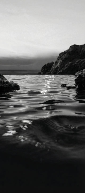 极简主义风格的岩石展台特写,展台主体为深灰色粗糙岩石材质,呈现自然的层理结构与不规则边缘,右侧点缀一小簇翠绿色苔藓,左侧伸出几株细长的深绿色水草,岩石下方有一滴水珠正坠入下方平静的深蓝色水面,激起一圈圈涟漪,背景为渐变的淡蓝色到白色的柔和色调,光线从上方偏左位置柔和洒落,在岩石表面形成细腻的高光与阴影对比,整体画面简洁、宁静,具有现代禅意美学。