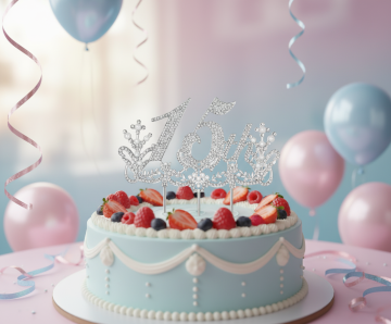 一个3D卡通风格的生日蛋糕,3D渲染质感、圆润可爱的造型风格、柔和光影及细腻材质表现,规整排布于同一画面中。粉色系双层生日蛋糕,装饰有奶油花边、彩色糖珠、写有“Happy Birthday!”的立体字母牌、粉色和橙色气球、条纹生日帽、礼物盒;,画面整洁有序,信息传达清晰。