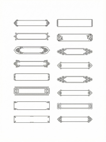 一组不同配色与样式的中式边框设计集合,白色背景,包含多种几何形状的边框:上方为两个水平长条形边框,左侧为黑色细线勾勒,四角有简约方形纹饰,右侧为金色细线条,四角带有回纹装饰;中间部分是两行各三个方形边框,上行三个为黑色线条,边框四角装饰有传统中式纹样,纹样复杂度略有不同,下行三个为金色线条,同样在四角有精致的回纹和几何图案;底部则是两个特殊形状边框,左侧为黑色线条勾勒的八边形如意纹边框,边缘有连续的波浪形和对称花卉图案,右侧为金色圆形边框,边缘环绕着细密的连续回纹和点状装饰,所有边框线条均匀流畅,图案对称工整,具有浓厚的中国传统装饰风格,整体设计简洁大方,适合作为各类设计作品的装饰性框架使用。