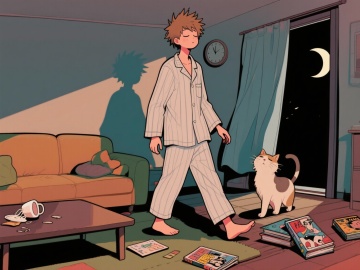 像素风漫画,温馨夜晚,情侣相拥入睡,宠物相伴,城市夜景窗外。