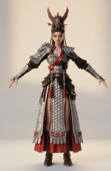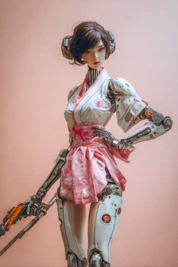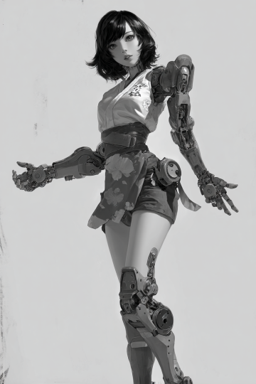 赛博朋克风机械女性,融合未来感与科技感,金属机身搭配霓虹灯背景,3D重拟物设计展现机能美学。
