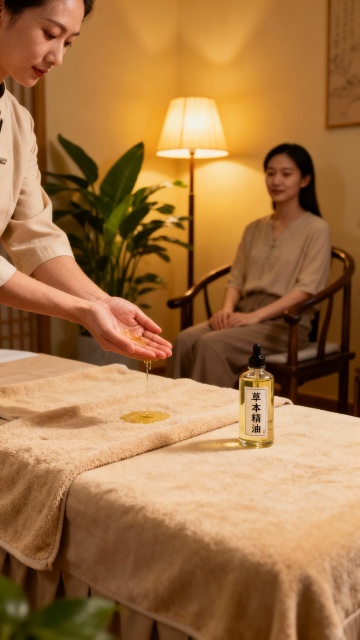温暖柔和的自然光透过竹帘洒入,营造出宁静舒适的氛围。一位专业的按摩师正手持白色陶瓷小壶,将金黄色的按摩精油缓缓滴落在顾客的背部。顾客趴在铺着洁白毛巾的按摩床上,背部肌肤在阳光下泛着健康的光泽。背景是简约雅致的木质装饰和绿色植物,整体环境充满自然、放松的感觉,光线柔和温暖,突出精油滴落的瞬间和肌肤的质感,营造出高端SPA的舒适体验。