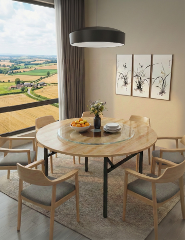 明亮通透的现代简约风格餐厅内部场景,以白色和浅木色为主色调,自然光透过大面积落地窗洒入室内,天花板悬挂着线条简洁的几何形白色吊灯,中央区域摆放着铺有浅色亚麻桌布的圆形餐桌,搭配浅灰色布艺餐椅,餐桌中央点缀着小型绿植花艺,靠墙设置悬浮式浅木色餐边柜,陈列着精致的玻璃器皿,角落处放置一个造型简约的藤编花瓶,插有几支白色和浅粉色的长茎鲜花,地面铺设浅色木地板,整体空间干净整洁、温馨舒适,充满自然清新的气息。