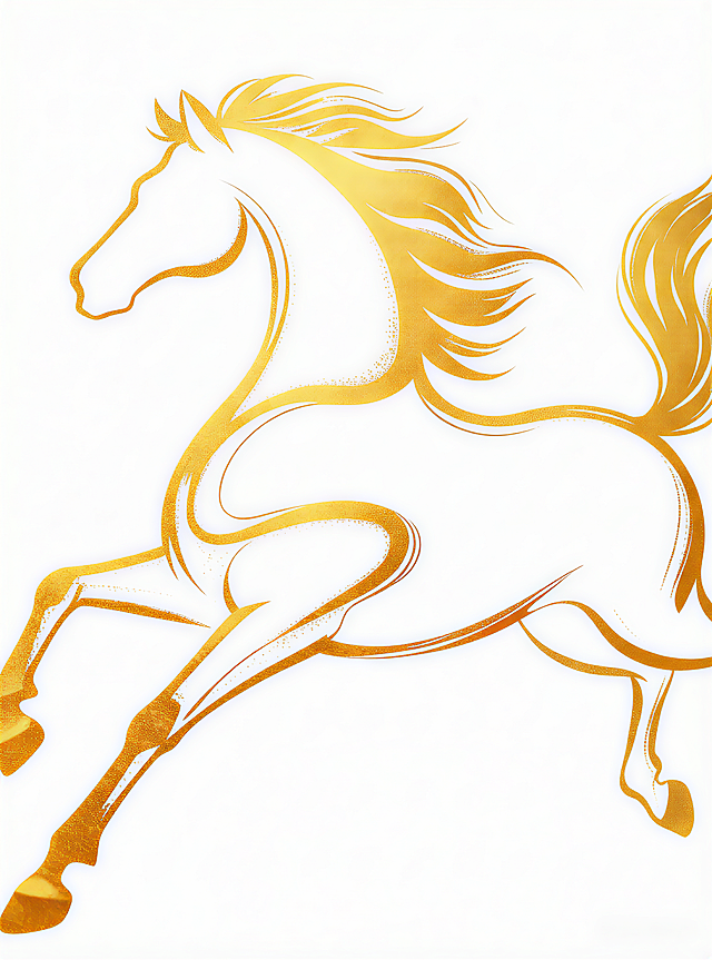主体是黑金渐变奔马(马身饰 宝相金纹,鬃尾呈流线飘逸质感,周身环绕金色光晕),色调以红、金为主,风格华贵喜庆,白色背景,营造动感十足的新年氛围。详情