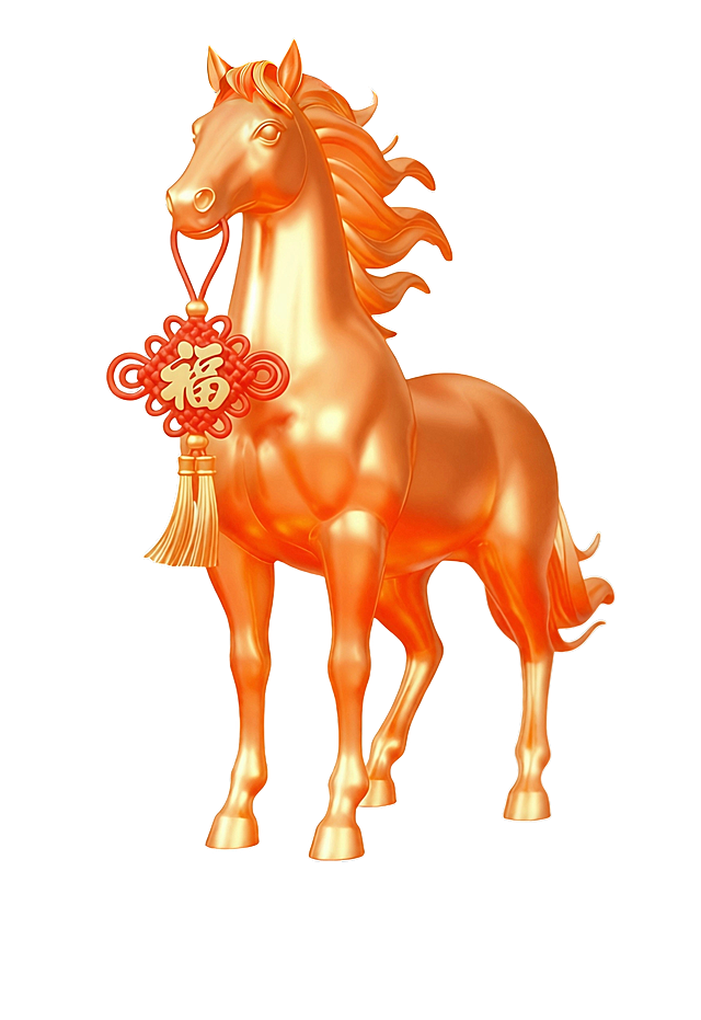 主体是赤红鎏金奔马(马身饰 “喜” 字纹样和缠枝金纹,鬃尾呈柔滑飘逸质感,鎏金部位反光细腻),色调以红、金为主,风格华贵喜庆。背景是纯黑色,点缀金色铜钱串与红色中国结,传递招财纳喜之意。详情