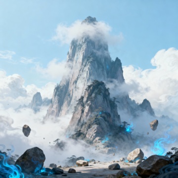 水墨风与插画风交融,云海缭绕山巅,光影流转间透出梦幻与神圣感,松柏苍劲,剑气如丝,唯美的虚拟自然画卷,静谧中蕴藏神秘东方意境。