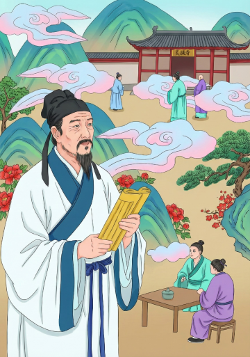 古典中式插画风,水墨渲染竹林书院,师徒传道授业,意境深远。