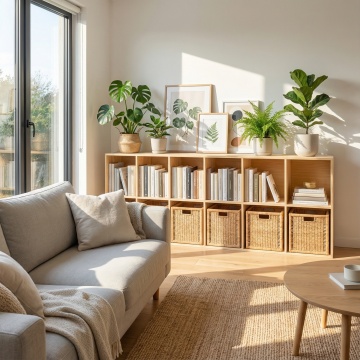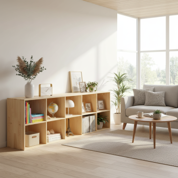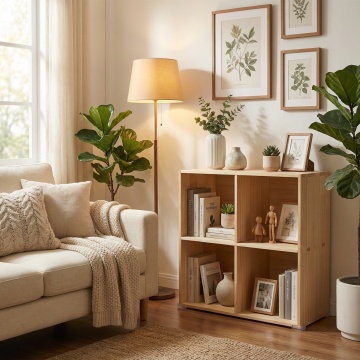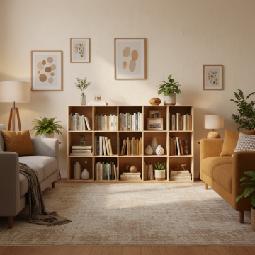 这是一个三层5格书柜 生成三张亚马逊场景图,尺寸1600*1600 分别为客厅温馨场景、书房简约场景和开放空间温馨场景,突出显示书柜产品