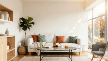 极简主义风格室内场景,以纯净的白色为主色调,搭配原木色地板与浅灰色布艺沙发,柔和的自然光透过白色纱帘洒入,营造出明亮通透、宁静舒适的氛围。画面中巨大的白色背景墙简洁干净,低矮的浅色木质茶几上摆放着简约的陶瓷花瓶与蜡烛摆件,沙发上散落着几个白色与浅蓝色靠垫,一侧随意搭着浅灰色毛毯。左侧悬挂着三个球形白色吊灯,旁边的木质层架上陈列着白色陶瓷器皿与装饰画,右侧窗边有大型绿植增添生机。整体构图采用开放式布局,线条流畅,空间感强,注重留白设计,呈现出简约而不失格调的现代家居美学。