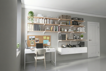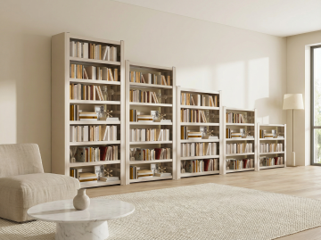 极简主义风格的不同场景布置书桌背景,温暖的原木色调(浅橡木色为主),柔和均匀的间接照明(桌面上方嵌入式灯带提供主要光源),3D渲染的光滑木质纹理,明亮通透的氛围,简约现代的书桌设计(与墙面嵌入式书架一体化),配套的浅米色布艺办公椅(金属细腿),书桌上配备极简设计的黄铜色台灯、黑色屏幕的电脑主机,书架上整齐排列着不同颜色的书籍、文件夹、黑色陶瓷花瓶和白色收纳盒,整体构图采用对称美学,景深控制得当,光线营造出宁静舒适的居家办公或学习环境,不同场景可包括:一侧增加绿植点缀的书桌、桌面摆放笔记本和咖啡杯的阅读角落书桌、书架上陈列更多装饰摆件的个性化书桌、带有小型打印机或扫描仪的功能性书桌等,保持统一的原木色调和极简设计语言,确保各场景下的光影质感和材质表现与原图高度一致。