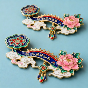 中式建筑微缩插画徽章,融合复古描边与金属浮雕工艺,喜庆色彩搭配祥云、花鸟元素,展现浓厚民族风情与节日氛围。