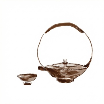 一系列6个中国传统茶具主题的插画,保持原有的水墨手绘风格,粗重有力的黑色轮廓线条,内部填充以不同的纯色,背景为单一纯色。每个插画中的茶具元素完全不同,包括茶壶、茶杯、茶盘、茶叶罐、公道杯、盖碗等,元素类目保持茶具相关。所有插画规整地排布在一起,形成一个统一的系列素材集合。