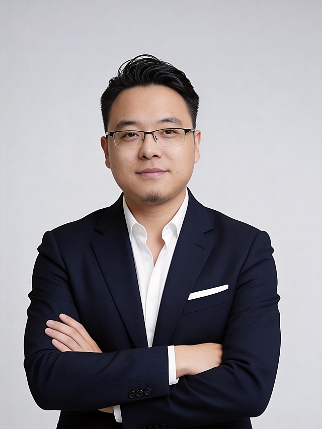 参考第一张图保留人物脸型、发型、年龄等特征生成职场形象照,参考第二张图人物占位和比例,标准焦段50mm,F/4光圈(F/2.8-F/4区间),平视视角(镜头与人物视线齐平);人物占画面70%,人物居中(居中构图),位于画面中心,为视觉聚焦点,入境范围头部及以下至臀部下方10cm(半身像);左右留少量背景空间;头部与画面顶部保留5%空间;头部发型完整,头肩比例协调;身着深黑色精纺羊毛混纺西装(面料呈细腻微微哑光质感);内搭高支精梳棉白色衬衫(面料带轻微柔光质感);下装同色系深黑色西裤,深色头层牛皮细皮带(宽度1.5cm),着装正式干练;正式严谨专业稳重,身形匀称,姿态端正。呈正面单手插兜的站立姿态仅露出手腕部分),肢体自然,自信从容;发梢微微修整干练大气,主体锐利,影棚侧光布光(主光来自画面前方),明暗过渡柔和,背景光线均匀,强化色彩对比的高级感。简约偏冷调中深灰度纯色背景(呈现均匀柔和质感),极简干净;32K画质超高分辨率、细节清晰,现代精致感风格;肤质精细化处理;眼神直视镜头,目光坚定且澄澈,表情自然.嘴角上扬;面部光比1:1.5,4800K中性光,微微修饰脸型,肤质哑光细腻,面部雾面柔光,轻透裸肌感,真实毛孔纹理,32K画质,去除人物之外的所有元素。严格按照第一张图内容生成。详情