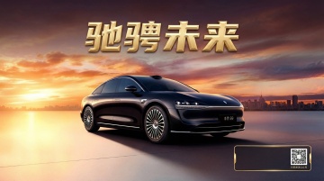俯视角构图,一辆哑光熔岩红豪华电动SUV正以优雅姿态驶过城市中央公园的悬浮车道,车身流畅的溜背线条在晨曦中切割出锐利的光影,22英寸多辐式星芒轮毂包裹着红色制动卡钳,动态行驶中扬起细微的能量粒子。背景是玻璃幕墙建筑群构成的未来天际线,部分摩天楼顶部穿入晨雾,天空呈现由钴蓝向粉紫渐变的朝霞,无人机群组成品牌Logo在空中盘旋。路面反射着建筑的几何光影,车前灯投射出锐利的光束切开薄雾,整体色调融合科技蓝与活力红,营造出既奢华又充满未来感的视觉冲击。