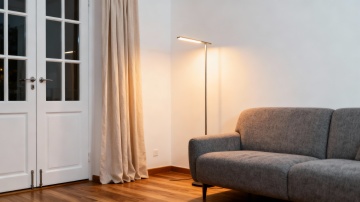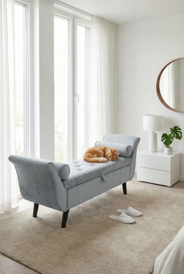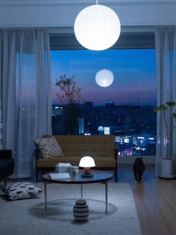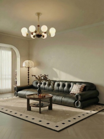 现代简约风格的客厅室内设计,主体为一个线条流畅、造型独特的模块化布艺沙发,沙发采用深灰色高级绒布面料,搭配几个不同大小和纹理的几何图案靠垫,沙发下方是纤细的金属支撑腿。客厅整体色调以冷静的灰蓝色为主,墙面为浅灰色哑光质感,地面铺设浅色宽木地板。左侧有一扇大窗户,悬挂着半透明的浅灰色垂坠感窗帘,阳光透过窗户柔和地洒入室内。沙发前铺着一块浅灰色带有细腻纹理的长方形地毯,地毯上放置一个圆形黑色金属框架小茶几,茶几上摆放着一本翻开的设计杂志和一个简约的陶瓷花瓶。沙发后方的墙上挂着一幅抽象的几何线条装饰画,画框为细黑色。右侧角落放置一盆大型的琴叶榕绿植,增添自然气息。天花板中央悬挂着一盏造型简约的黑色金属吊灯,灯光温暖柔和,营造出宁静、舒适且富有设计感的居住氛围。整个空间布局合理,注重留白和线条的简洁,展现出北欧极简主义的设计美学。