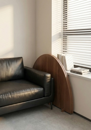 极简主义风格室内场景,柔和的米白色墙壁,自然光透过木质百叶窗和米色垂坠窗帘洒入,浅灰色木地板上铺着带有细腻波浪纹理的浅色地毯。房间中央是一张造型圆润、线条流畅的白色羊羔绒单人沙发,搭配一个橄榄绿色的方形靠垫。沙发旁是一个白色圆柱形边桌,桌面上摆放着一本翻开的书和一个插有细枝绿植的透明玻璃花瓶。沙发后方墙上悬挂着一幅现代抽象画,画作以棕色、米色、白色和橙色的大胆笔触构成,带有明显的颜料肌理感。右侧是嵌入式浅木色置物架,其中一层放置着一个透明玻璃花瓶,里面插有绿色植物。整体色调温暖柔和,光影层次丰富,营造出宁静、舒适、简约而不失格调的居住氛围,空间布局通透,细节处理精致,具有现代简约的高级设计感。
