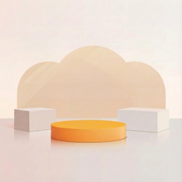 简洁现代展台设计,圆形白色展台置于画面底部中央,展台表面光滑有细微反光,带有柔和阴影。背景为渐变深空蓝色,左侧有垂直排列的三个半透明渐变浅蓝色长方体立柱,右侧悬浮一个发光的浅蓝色环形光晕,光晕边缘柔和渐变,整体光线柔和,营造出科技感与未来感,画面简洁干净,无任何文字和多余元素。