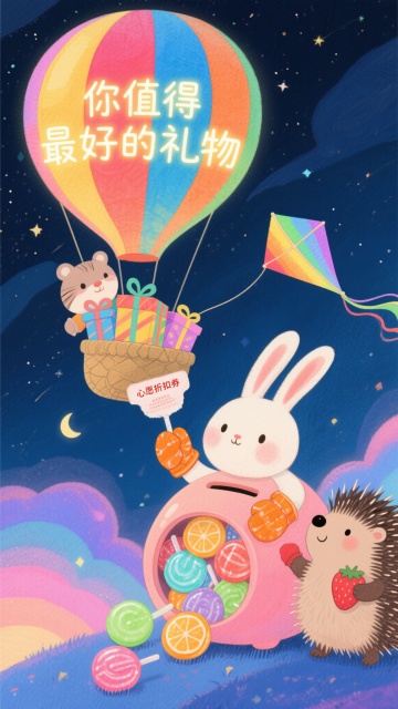 清新插画风,卡通拟人太阳与气球,传递欢乐氛围。
