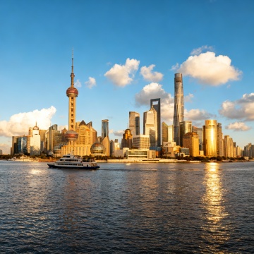 上海陆家嘴天际线全景,以东方明珠电视塔为视觉中心,其独特的球体结构与红色装饰带清晰可见,周围环绕上海环球金融中心、上海中心大厦等现代化摩天大楼群,建筑细节丰富,玻璃幕墙反射蓝天。黄浦江横亘前景,江面上有几艘白色游船平稳行驶,水面波光粼粼。整体采用写实摄影风格,色彩明快,以蓝色天空为背景,光线明亮柔和,呈现出晴朗白天的通透感。构图遵循三分法,建筑群占据画面主体,江面与天空形成自然分割,展现出上海作为国际化大都市的繁华与现代气息。