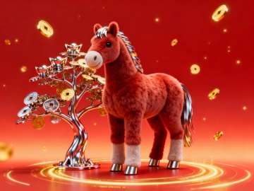 软3D风格萌马立于鎏金钱币树旁,毛发生长质感细腻,金属脚蹄闪耀,喜庆红背景中金币飞舞,卡通可爱与重拟物结合,洋溢春节喜庆氛围。
