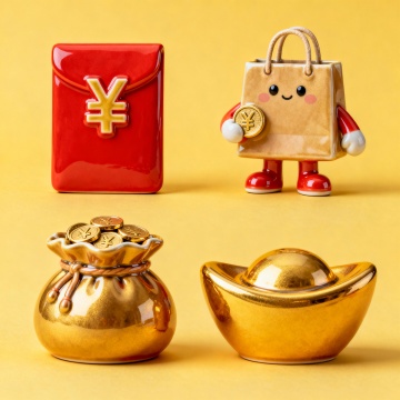 喜庆红金配色,融合卡通拟人与重拟物设计,3D立体质感突出,金属鎏金风彰显节日氛围,传递新春祝福与财富寓意。