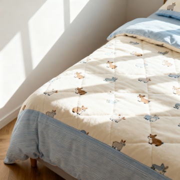 一张温馨风格的卧室床品展示图,3D渲染质感,柔和的暖米色与浅棕色格纹被子铺在床上,搭配白色枕头和浅棕色床头板,整体色调温暖和谐,光线柔和均匀,营造出舒适宁静的氛围,被子边缘自然垂落,展现出柔软的材质感,构图简洁大方,突出床品的温馨舒适特质。