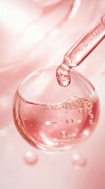 透明玻璃质感的细胞悬浮在柔和的蓝白色光晕背景中,中央细胞内部包含精致的分子结构模型,周围环绕着多个大小不一的透明气泡,一支玻璃滴管正将一滴液体滴向中央细胞,整体呈现出高度写实的3D渲染效果,光影层次丰富,高光与阴影过渡自然,营造出纯净、科技感与精密科学的氛围,画面具有清晰的视觉焦点和梦幻般的透明质感。