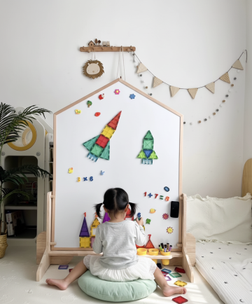 加一个亚洲小女孩在画板上涂鸦,背对着镜头