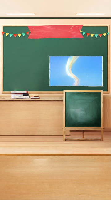 尺寸为1080X1920,,画面整体为鲜艳明亮的暖色调,背景为的教室内景(三分之二可见黑板,三分之一为窗户,窗外是阳光明媚的校园风景,不要出现天花板),前景是课桌(桌面纹理清晰,无遮挡),聚焦在前景课桌上,画面重心居下