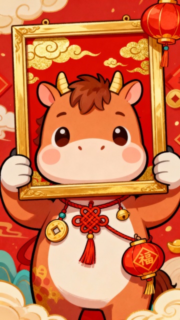 统一风格设定:卡通手绘风格,暖色调为主,线条圆润活泼,色彩饱和度高,画面带轻微肌理质感;主体为古灵精怪的棕白相间动画小马,大眼睛、短鬃毛、小短腿,表情灵动俏皮,动作充满生活感;背景融入2026年新年元素(春联、灯笼、福字、烟花),每张嵌入1个2025年网络热梗,整体氛围欢乐治愈,适合社交媒体传播。