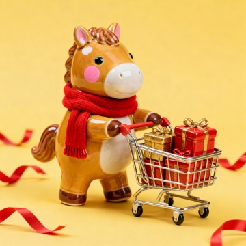 可爱卡通马推购物车,拟人化设计,软3D质感,金属购物车搭配红金礼盒,喜庆节日氛围,微缩艺术风格。