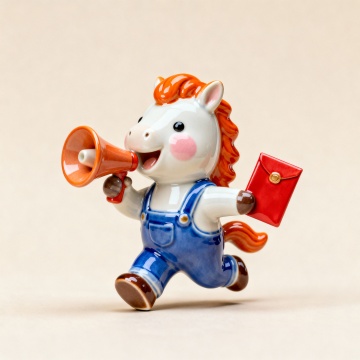 画面主体是一只卡通小马 —— 白底配橙色鬃毛,佩戴青绿与金色相间的装饰项圈,驮着一个大大的红包奔跑,米色纯色背景。