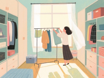性冷淡风简约空间,柔和光影洒落木质地板,清透窗景映衬静谧冬日,衣物自然垂挂,营造舒适面料质感与实景般的宁静氛围。