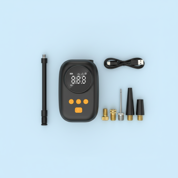 专业产品摄影风格,1:1正方形构图,俯视角度斜拍摄。画面中央是图二的充气泵主机,充气泵主机左侧放置着图三的充气管,右侧有一根黑色的USB充电线跟图一的气嘴适配器。整体光线均匀柔和,采用影棚灯光设置,产品表面有细腻的反光效果,黑色塑料外壳呈现哑光质感,黄色部件有鲜艳的色彩对比,金属部件有金属光泽。色调以黑色、黄色、白色、红色为主,浅蓝色背景形成简洁的色彩搭配。景深控制精准,所有产品都清晰锐利,表面反射柔和自然。