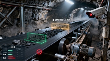 数据分析看板同时展示着“本班次大块检测统计”与“系统检测准确率:98.3%”的实时数据。整体氛围在持续的机械运行中凸显智能系统的先知性与冷静。科技感精炼地体现在三维尺寸测量、实时风险判定与预警联动逻辑的可视化上。风格为高度写实的煤矿井下场景,强调AI检测系统如何作为“前端的智能筛网”,通过深度视觉分析在煤流中即时识别并预警潜在堵塞源,从源头保障运输动脉的畅通与安全。”比例16:9