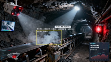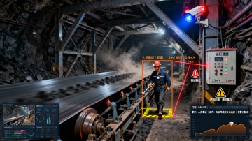 安装在输送带上方的矿用防爆AI摄像机正进行实时分析。其镜头集成可见光与激光雷达模块,边缘红色指示灯规律闪烁,象征边缘计算单元正在运行: