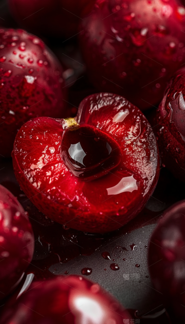 中近景构图,一个浅棕色竹编篮子里装满新鲜樱桃,樱桃表面覆盖着晶莹剔透的水珠,水珠在暖色调侧逆光下闪烁着高光,樱桃呈现出深红色与浅红色的自然渐变,果柄翠绿,篮子边缘有精细的编织纹理,篮内樱桃紧密堆叠,一颗樱桃从篮边滚落至木质桌面上,桌面呈现温暖的木纹质感,背景为模糊的浅棕色渐变,整体画面光影柔和,色彩饱满,营造出清新自然、水润诱人的氛围,超高细节,写实主义风格。