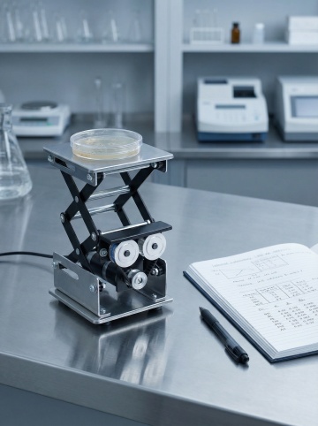生物/化学实验室,白炽灯照明,一个手动升降台置于实验台面上。台上固定着一台小型高速离心机,升降台被升至一个方便观察和操作的高度。旁边有微量移液器和冰盒,背景是试剂架。整体写实、无炫技,突出升降台的稳固与实用 比例3:4
