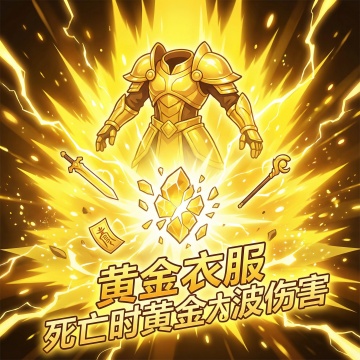 帮我生成3个BUFF类技能图 :黄金武器:物理和法术攻击有概率造成真实伤害,黄金项链:攻击速度和施法速度提高,黄金衣服:自身死亡时会造成黄金波伤害(伤害量基于攻击力、魔法力和道术力),风格要求:色彩鲜艳的卡通/动漫风,带有强烈的光效、动态特效,三个颜色以黄色为主色调,图案为正方形,无边框,