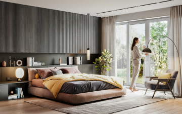 3D渲染的现代简约风格卧室,低饱和度墨绿色与暖灰色为主色调,柔和漫射自然光从右侧大面积落地窗洒入,木质地板温润有光泽,带有细微纹理。画面以床为视觉中心,床头采用浅灰色软包设计与深绿色墙面形成对比,床头两侧是黑色金属支架的玻璃台面床头柜,各放置一盏造型简约的白色球形台灯。床上铺着深绿色与灰色条纹的床单,搭配几个不同材质的灰色抱枕和一条米色针织毯随意搭在床尾。床尾正对着一面悬挂着抽象几何线条装饰画的墙,画框为黑色细边框。左侧墙面嵌入一整面墙的深灰色推拉门衣柜,衣柜底部设计有开放式展示格,摆放着几本精装书和一个小型绿植盆栽。右侧窗边设有一个浅灰色布艺单人沙发,沙发旁是一个原木色小圆几,上面放着一个白色陶瓷花瓶,里面插着几支干花。地面铺着一块浅灰色短绒地毯,地毯上随意散落着一本翻开的杂志和一个编织篮。整个空间光影层次丰富,阴影柔和,营造出宁静舒适且极具现代设计感的休憩氛围,视觉层级清晰,信息传达简洁高效,符合现代都市年轻人群的审美需求。