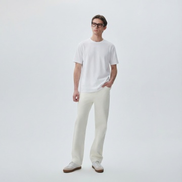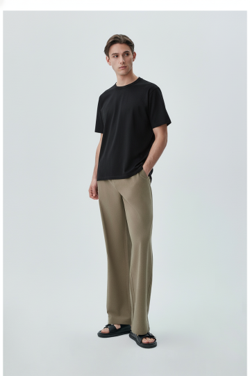一个亚洲男模特穿着图片上的登山裤,正面站在浅灰色背景前面,地面上有些落叶和树根,戴着墨镜,身穿白色长袖运动衣,运动衣上有红色撞色条纹,搭配卡其色户外登山鞋