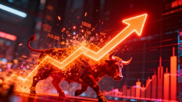 赛博朋克风格的金融数据可视化背景,深蓝色与霓虹粉为主色调,光影呈现科技感十足的网格光线与动态数据流,前景是发光的红色上升曲线图与蓝色网格线交织,背景为模糊的未来城市夜景,整体画面具有强烈的景深效果和玻璃质感,数据线条流畅且充满科技动态感,营造出高端、专业的金融科技氛围。