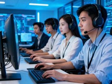一位戴着黑色头戴式耳机(带麦克风)的男性客服人员,身着黑色修身西装外套(单排双扣,左胸有口袋)和白色衬衫,双手自然交叠于身前,面带温和微笑,站姿挺拔端正。背景为纯浅灰色,光线均匀柔和,人物面部和服装细节清晰,具有高度写实的人像摄影风格,画面简洁专业,突出客服职业形象。