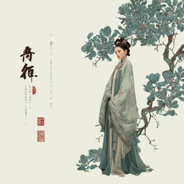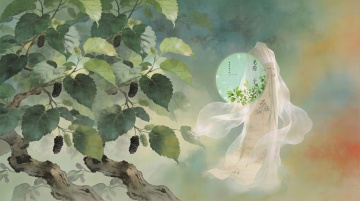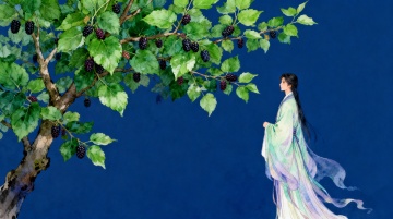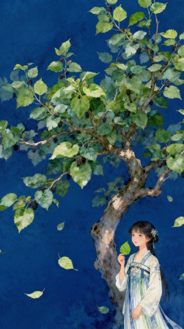 深蓝色打底,要求有桑树以及古衣两大元素,要求改为高19cm宽34cm,中间两大元素要求有一段距离,方便我后续加入文字内容