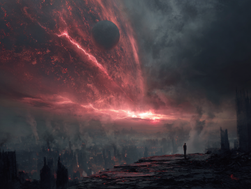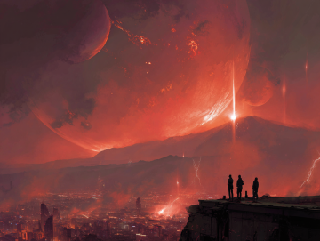 未来感飞船悬浮云端,3D梦幻波涛中人影飞翔,科技与超现实主义交织。