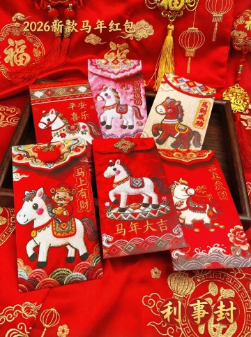 轻微俯拍视角,主体平放在红色渐变质感背景台面(占画面比40%),主体旁摆放印着 “马年大吉” 、鎏金马图案的长方形质感贺卡,台面散落金色亮片、中国结、鞭炮元素。色调以正红、鎏金为主,自然光影,保证溶图效果。