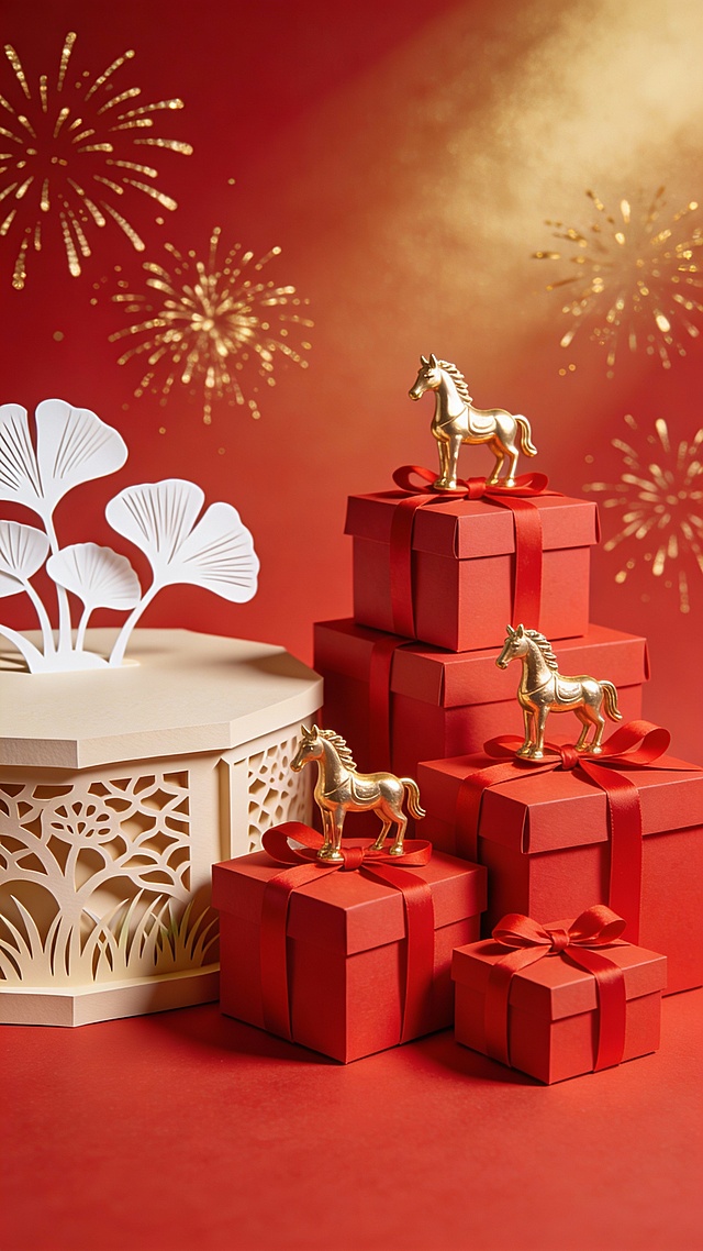 主体位于画面中心,被放置在金粉、金球装饰的高级感红色展台上(主体占画面比30%),背景为渐变红(中国结、金色彩带、金马剪影点缀,虚化)。整体呈现喜庆高级的新年主题氛围,正面视角,自然光影保证溶图效果。详情